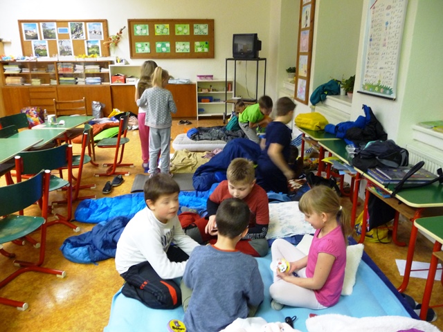 Celý večer jsme se těšili na stezku odvahy potemnělou školou … a zvládli jsme to. Za odvahu jsme si odnesli drobnou odměnu. No a po nutné hygieně jsme šli spát. Na dobrou noc jsme si poslechli pohádku O ošklivém káčátku od pana Andersena.